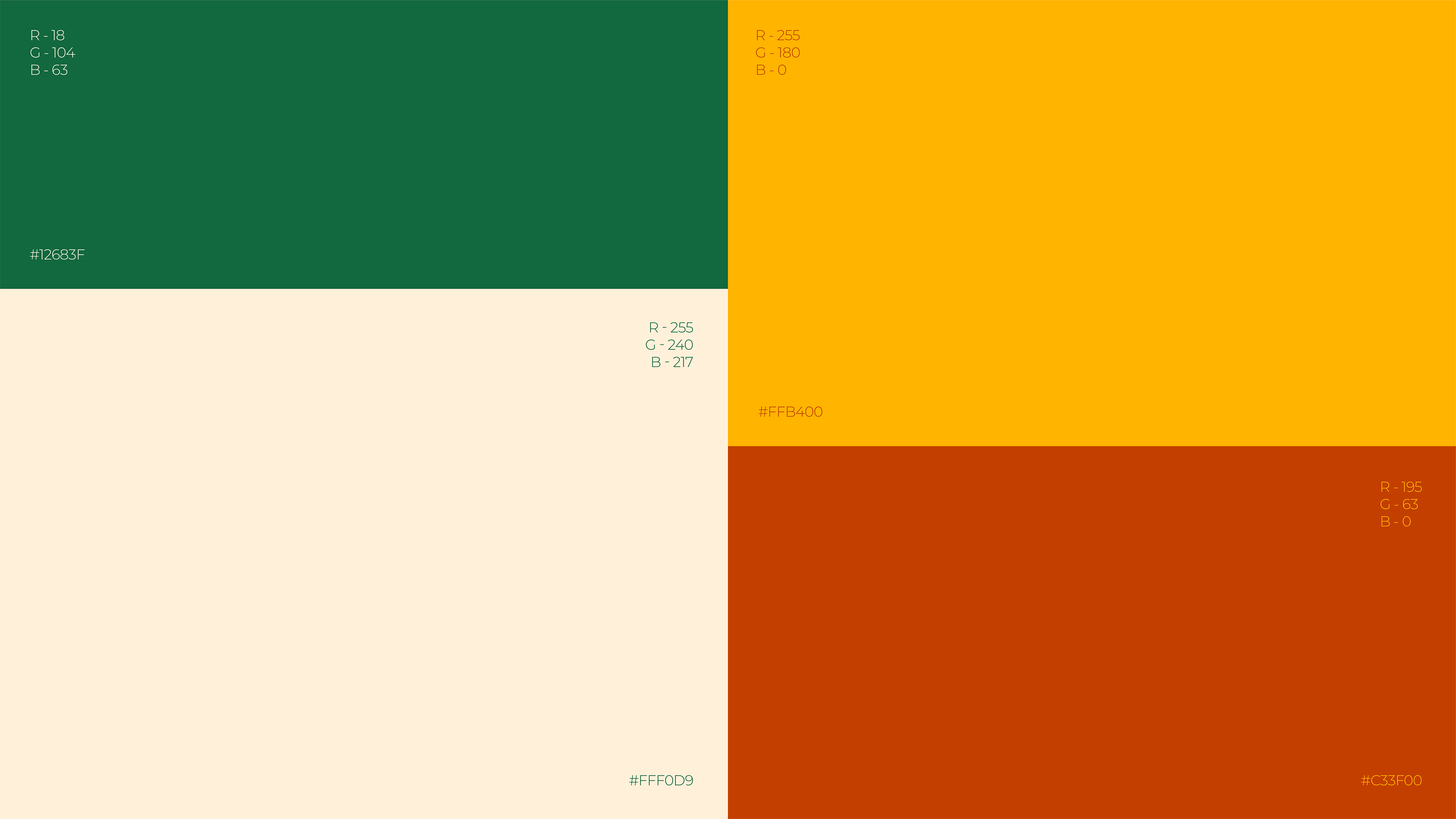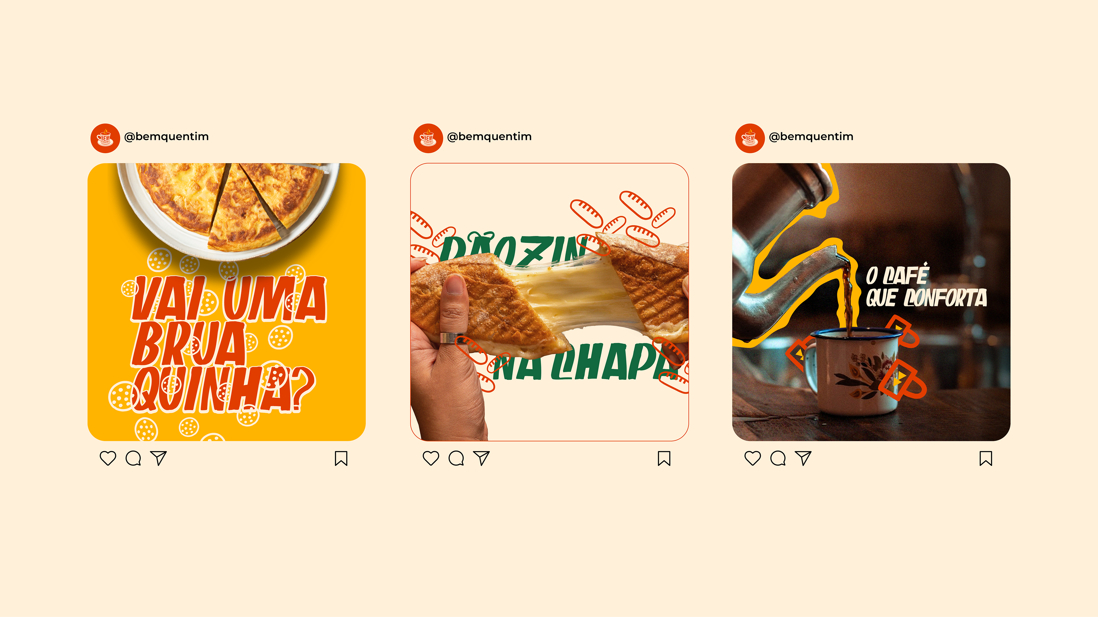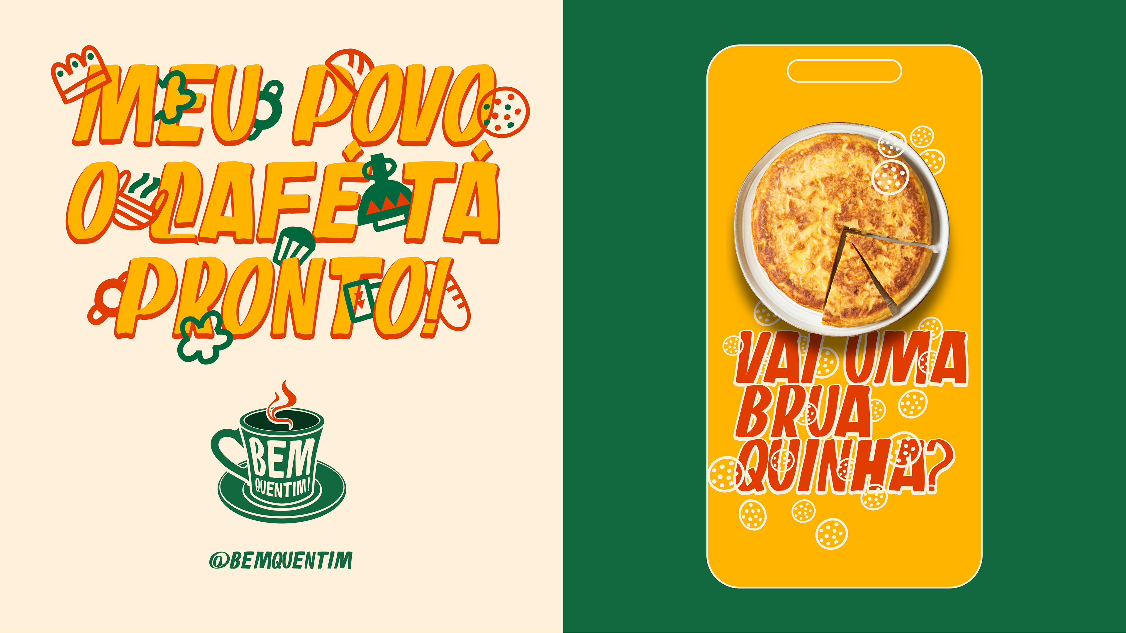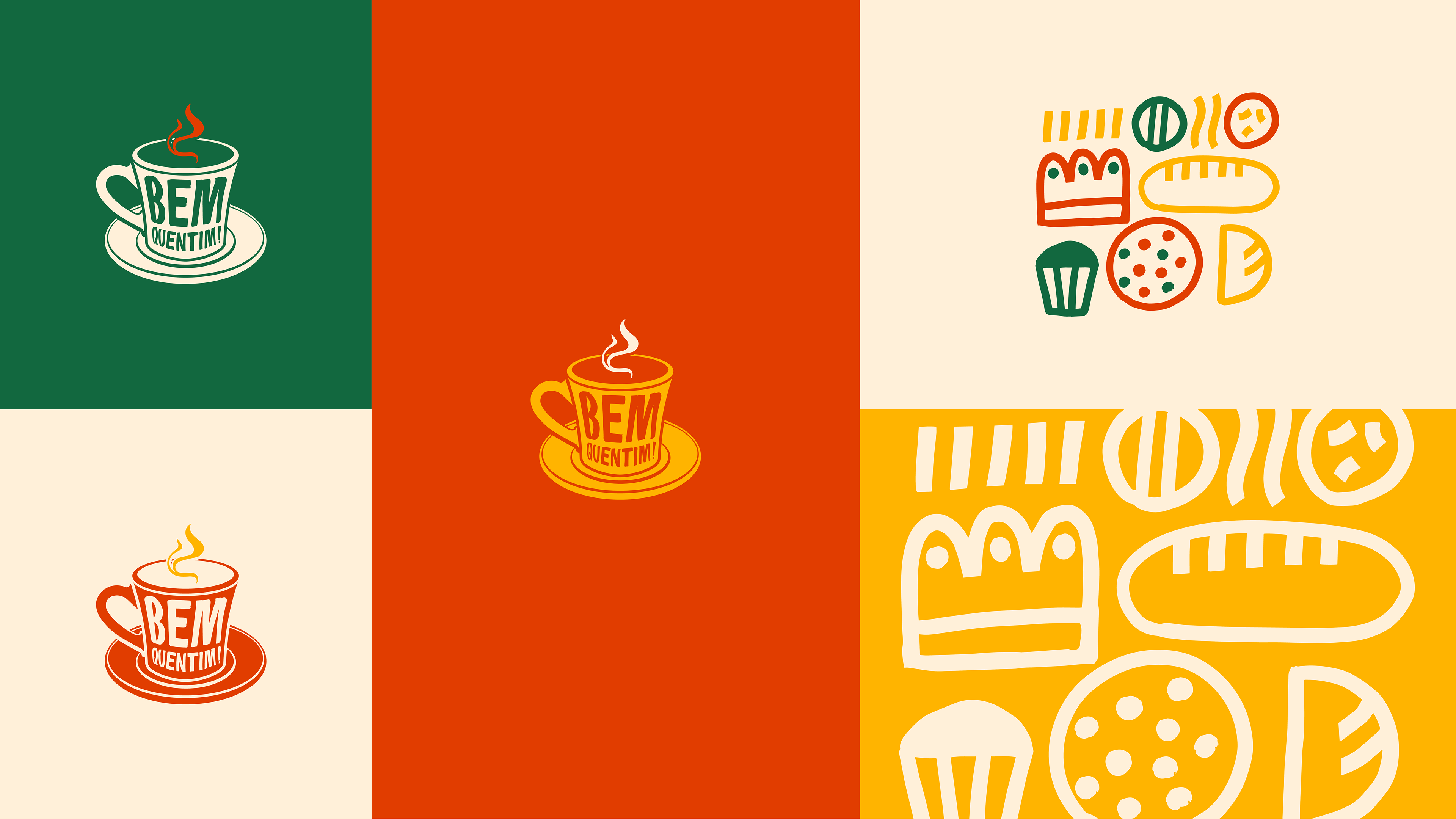 Bem Quentim’s color palette was developed to visually convey the warm, affectionate and vibrant essence of the Brazilian Northeast. Green (#12683F) represents nature and the freshness of freshly brewed coffee; yellow (#FFB400) brings the energy of the Northeastern sun and human warmth; earthy red (#C33F00) refers to clay pots and the rusticity of cultural roots; and cream (#FFF0D9) balances the composition with lightness and warmth. Together, these colors evoke tradition, joy and authenticity — the brand’s main pillars.