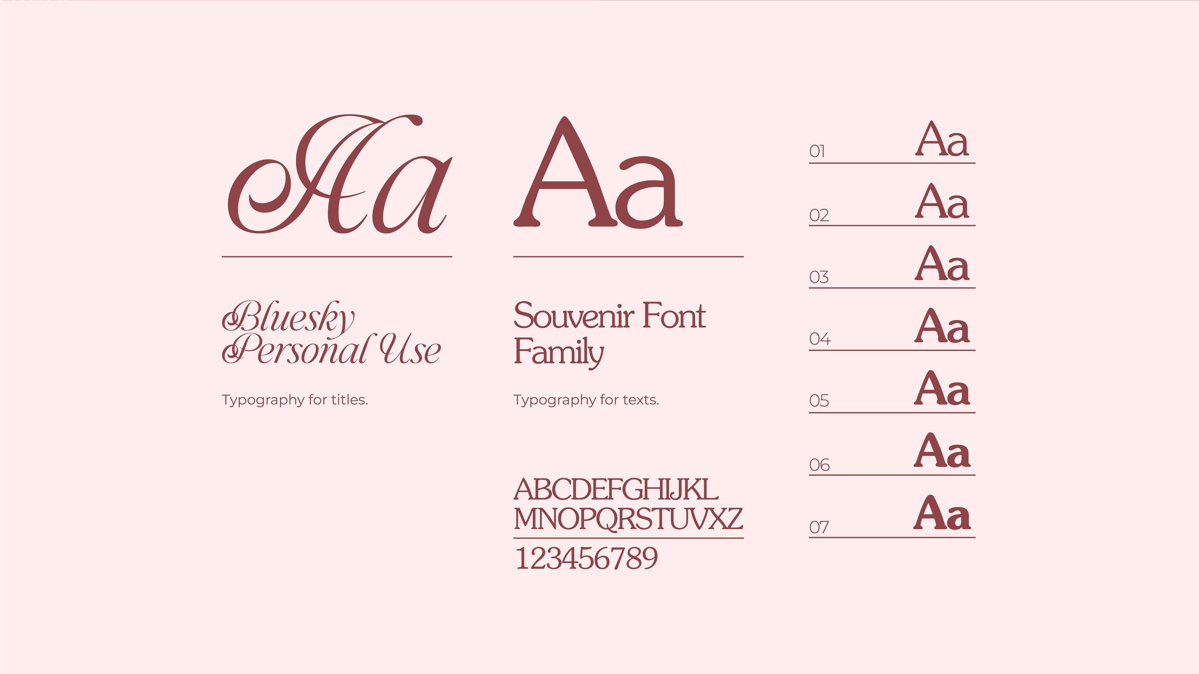 A identidade da marca combina a sofisticação clássica da Bluesky Personal Use, uma tipografia cursiva com traços elegantes, ideal para títulos e assinaturas visuais marcantes, com a legibilidade e charme retrô da Souvenir Font Family, perfeita para composições de texto corrido.